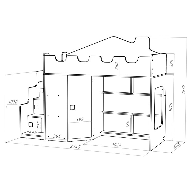 Эта модель кровати станет отличным выбором для вашего малыша. Благодаря угловой лестнице с дверцами и угловому шкафу, ребенок сможет легко и безопасно добраться до своего спального места, а также хранить свои игрушки и вещи в удобном месте.