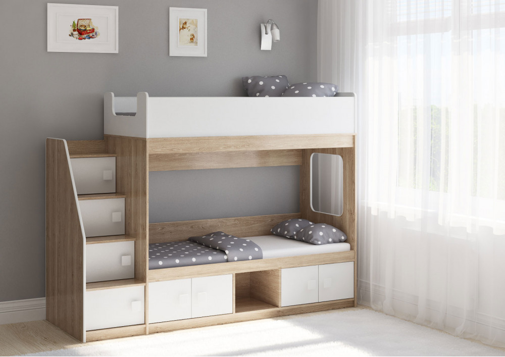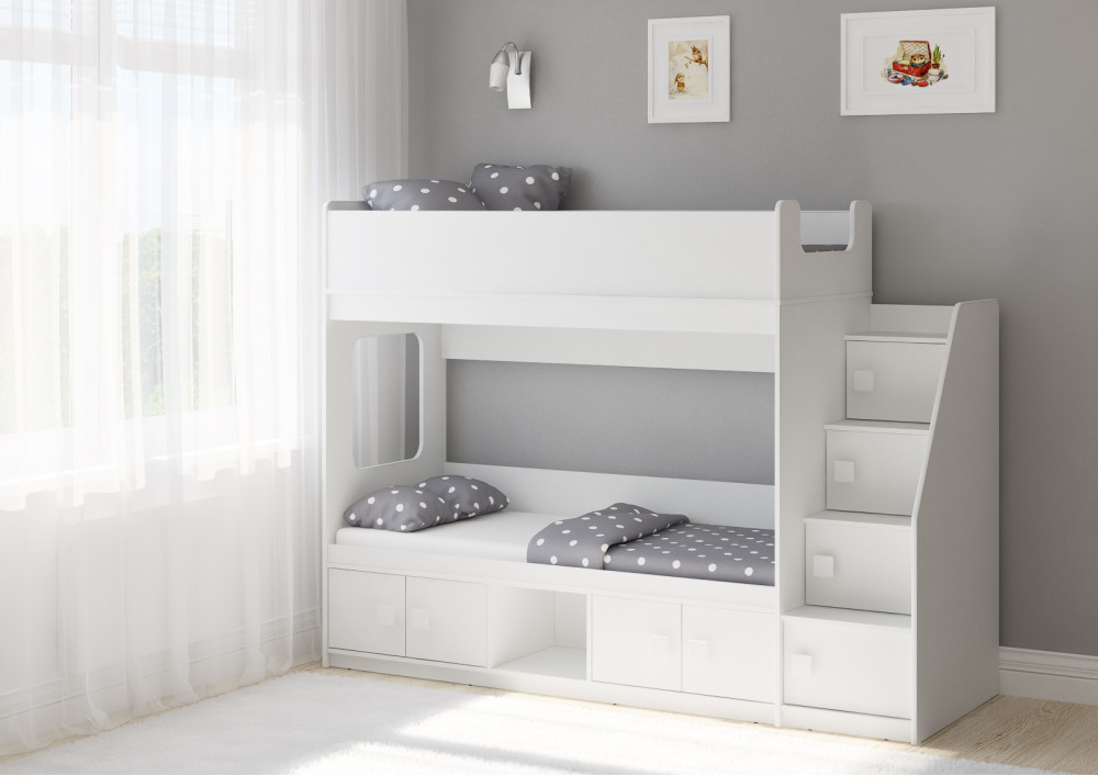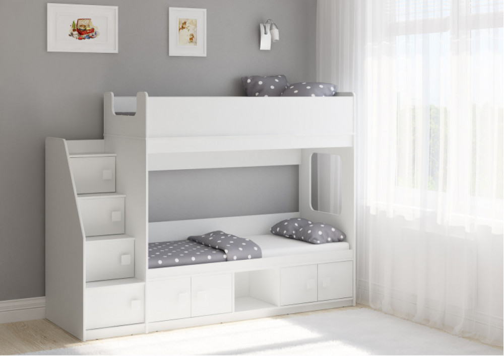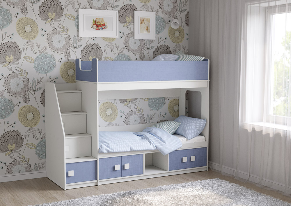 Классическая детская двухъярусная кровать с двумя параллельными спальными местами размером 1750х750 и 1900х750, закрытыми местами хранения и угловой лестницей-стеллажем.
