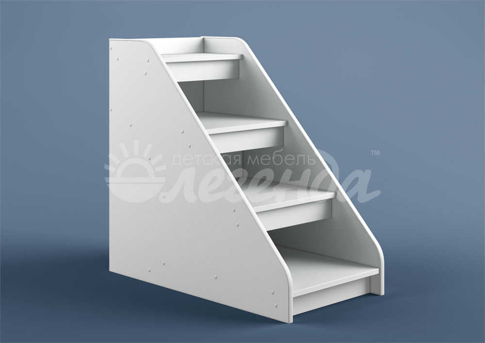Невысокая угловая лестница из четырех ступенек белого цвета .Лестница одновременно выполняет функцию стеллажа.